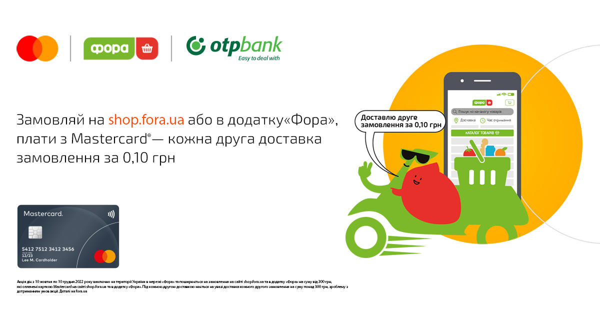 Акція діє з 10 жовтня по 10 грудня 2022 року виключно на території України в мережі «Фора» та поширюється на замовлення на сайті shop.fora.ua та в додатку «Фора» на суму від 300 грн, які оплачені карткою Mastercard на сайті shop.fora.ua та в додатку «Фора». Під кожною другою доставкою мається на увазі доставка кожного другого замовлення на суму понад 300 грн, зроблену з дотриманням умов акції. Деталі на fora.ua.